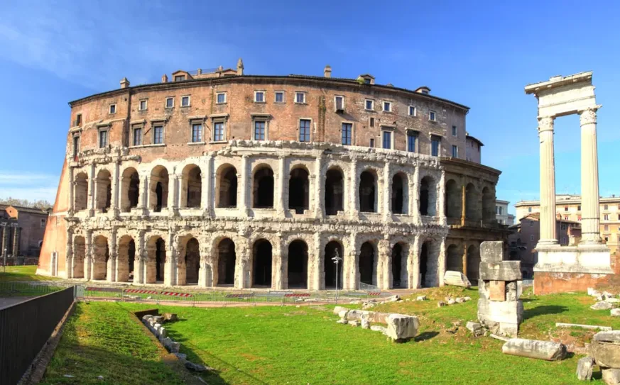 Театр Марцелла, збудований у Давньому Римі, був найбільшим і найважливішим театром, який міг вмістити від 15 000 до 20 000 глядачів. Зовнішній фасад був вкритий мармуром травертину. Півкруглий травертиновий фасад театру спочатку мав два яруси, кожен складався з 41 арки. Нижній ярус мав доричний ордер, другий — іонічний, а верхній, ймовірно, прикрашали коринфські пілястри. На пікових моментах свого існування театр приймав такі культурні заходи, як вистави, музичні змагання та поетичні вечори.