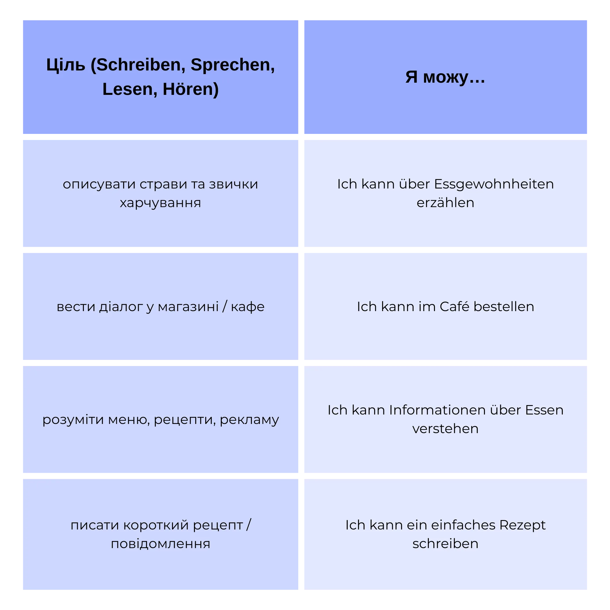 Розділ 4 “Essgewohnheiten” пропонує природний контекст для формування мовленнєвих компетентностей школярів і школярок 8(4) класу та розвитку їхньої здатності комунікувати у щоденних ситуаціях: купувати продукти, описувати страви, створювати рецепти, робити замовлення в кафе. Особливо ефективним цей розділ стає за умови використання інструментів формувального оцінювання, що дасть можливість дітям бачити цілі навчання, коригувати свої дії, відстежувати власний прогрес, усвідомлено взаємодіяти в парі та в групі.