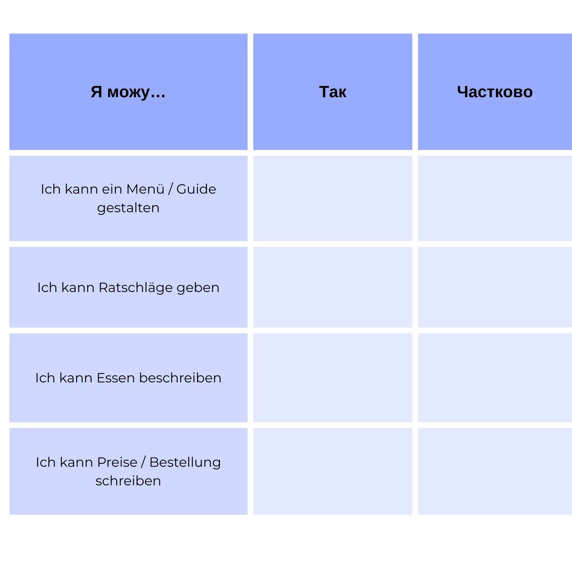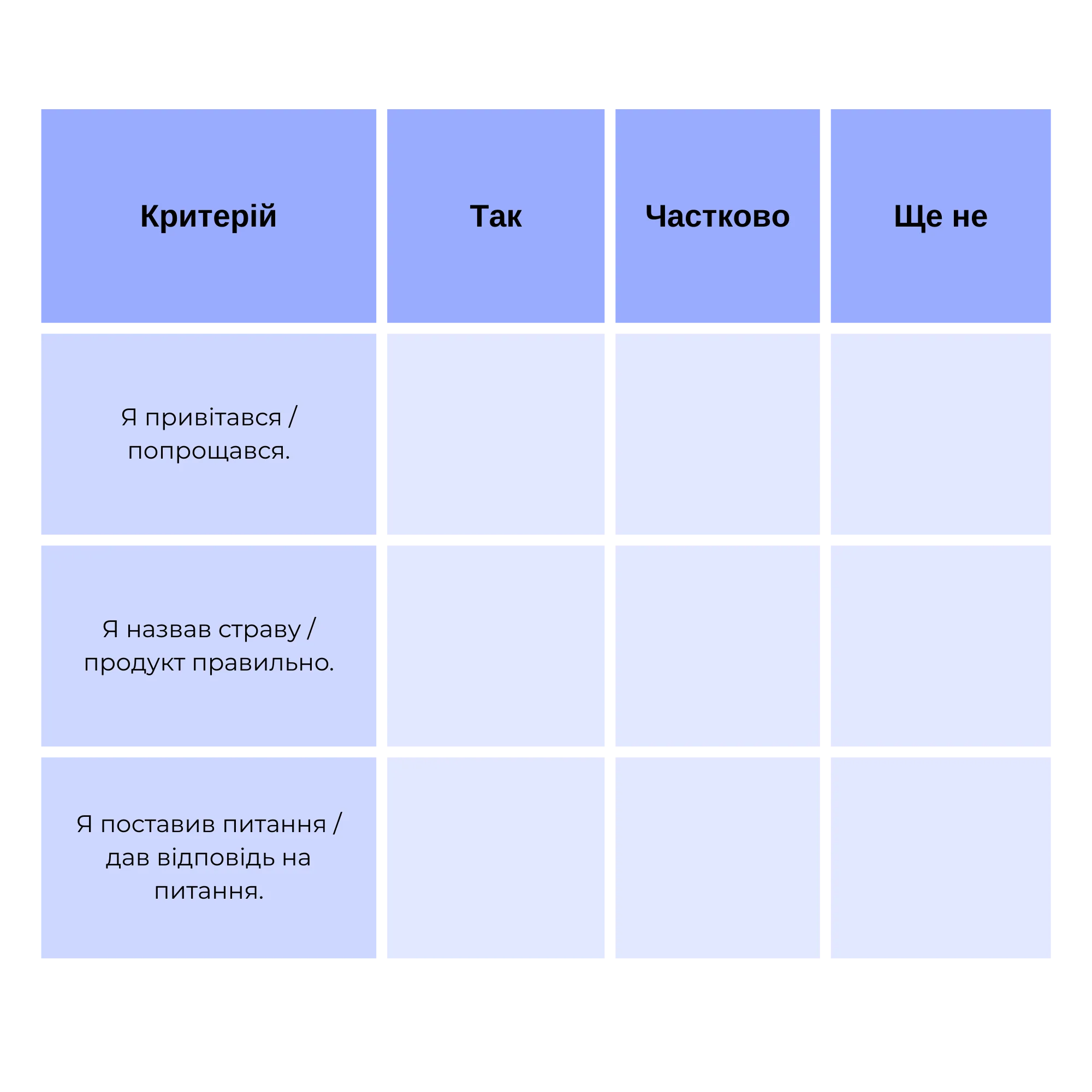 Учнівство створює просте меню кафе або вуличної їжі. Після цього проводимо “дегустацію меню”: кожна група оцінює іншу за критеріями: