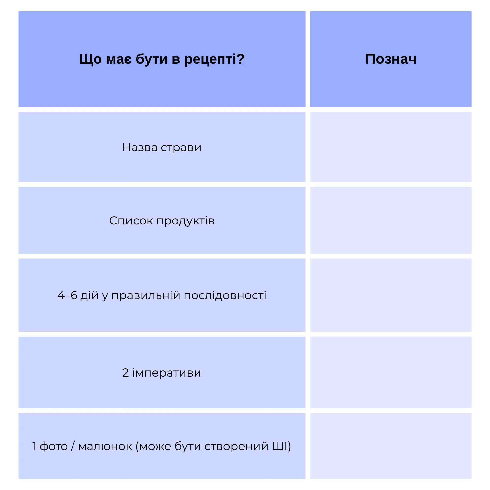Урок передбачає створення рецепта. Перед початком роботи школярі та школярки отримують чеклист: