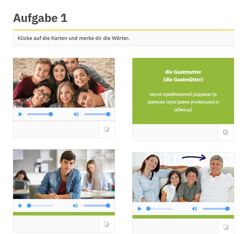 Якісне аудіо у виконанні носіїв мови дасть можливість формувати правильну вимову. Школярі мають нагоду читати, чути нові слова та бачити їх переклад, що задіє одночасно слухову та зорову пам’ять і сприяє кращому засвоєнню лексичного матеріалу (прослухати тут).