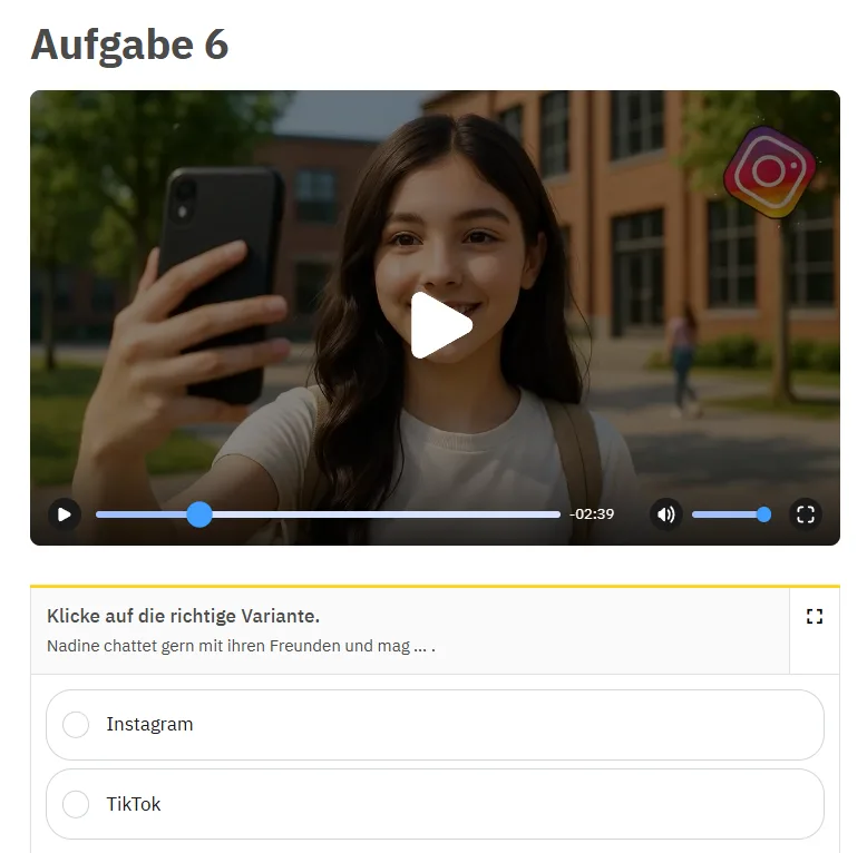 Відео та аудіо. Вправи з використанням відео та аудіо створюють реалістичний контекст для сприймання мови на слух. Учні можуть, наприклад, прослуховувати запитання і впорядковувати відповіді (прослухати тут).