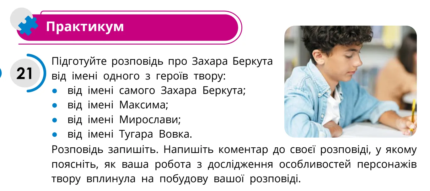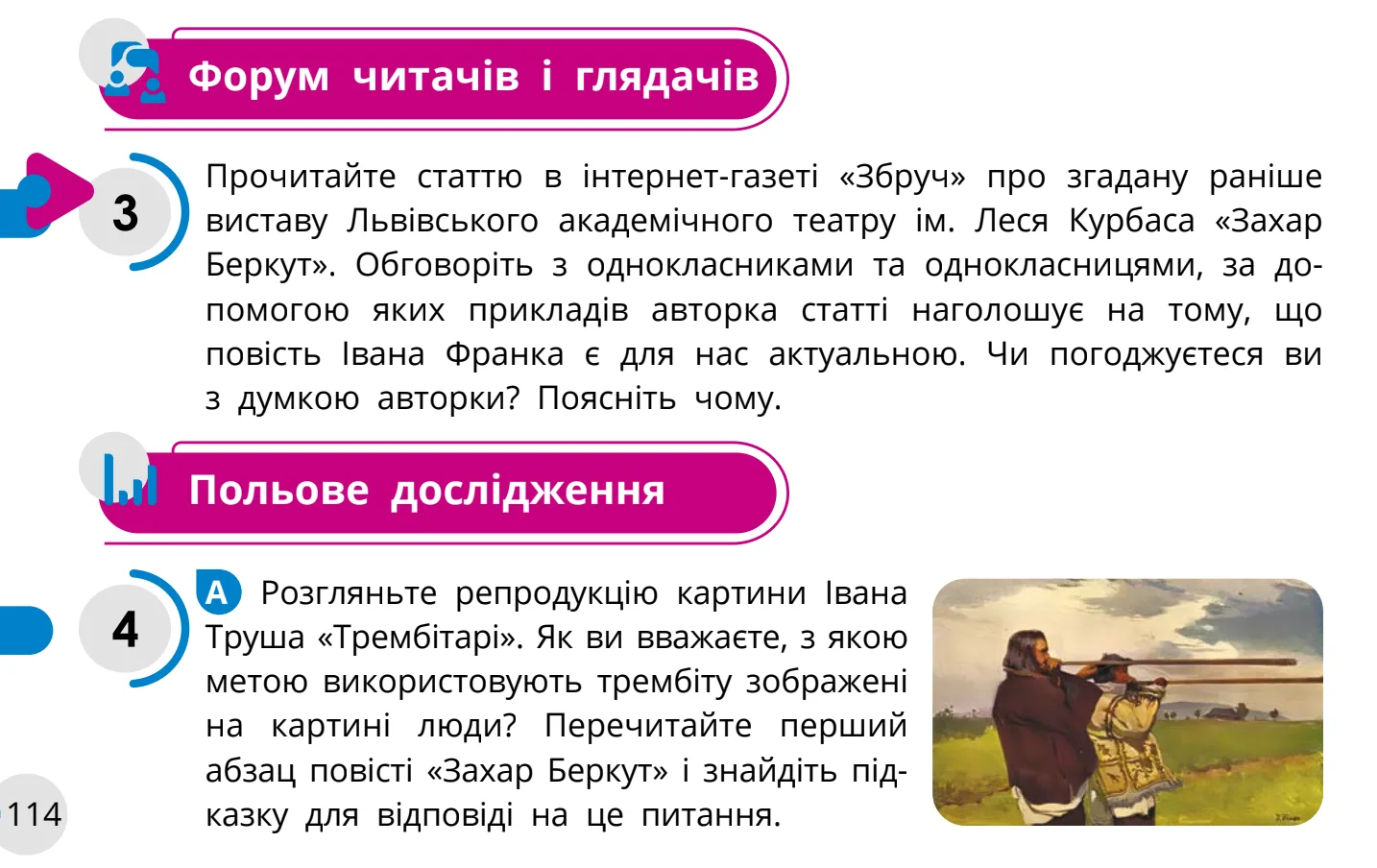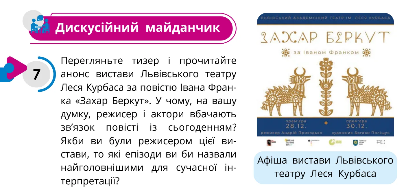 Розглядаючи повість Івана Франка «Захар Беркут», автори програми та підручника пропонують: