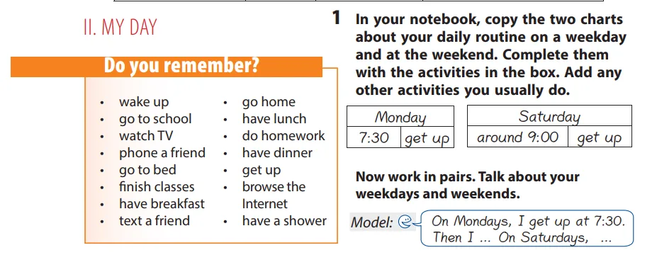 «On Mondays I get up at 7:30. Then I go to school. On Saturdays I get up around 9:00 and play computer games.»